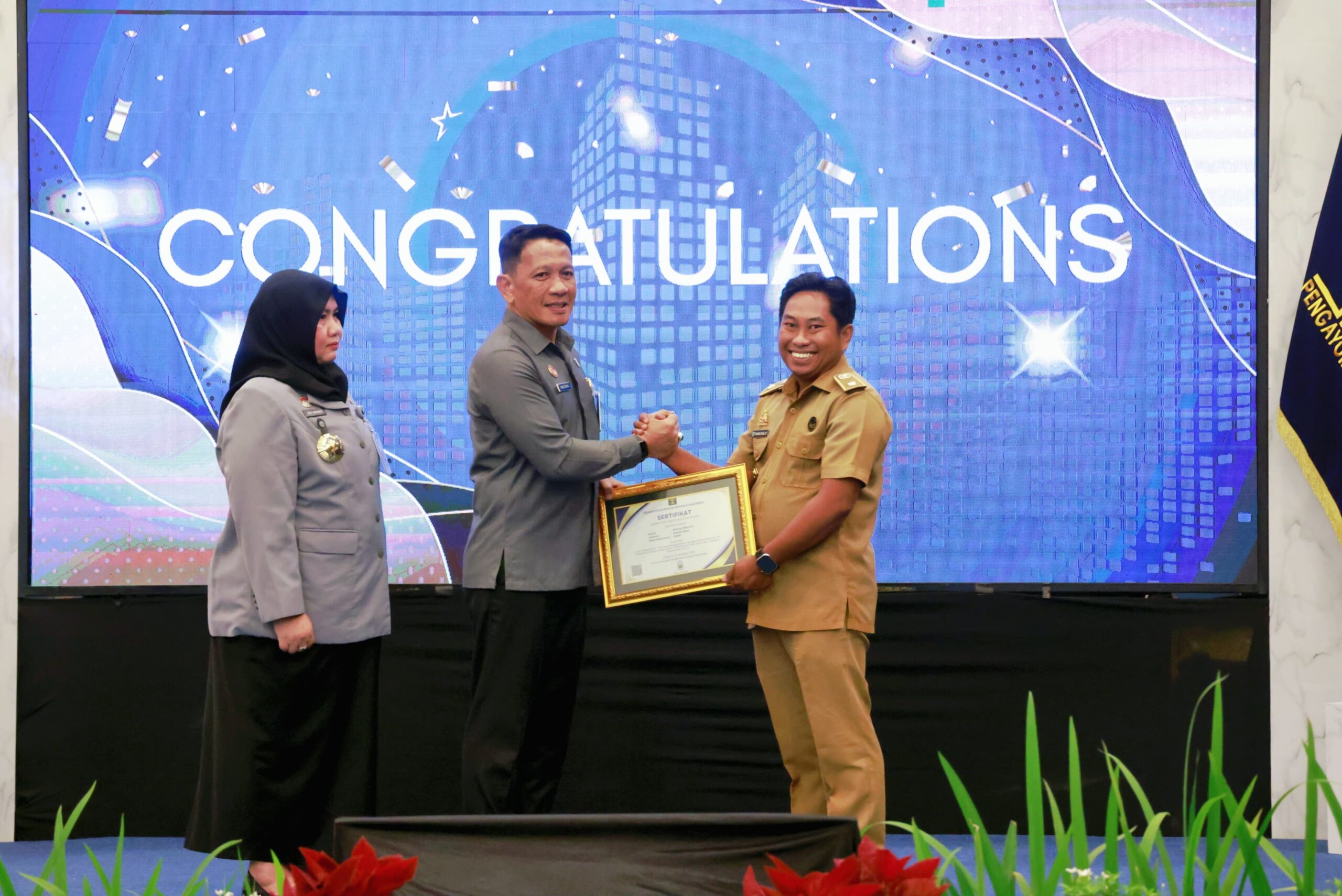 Kabupaten Barru turut menerima penghargaan Posbakum 100 Persen dari Kementerian Hukum dan HAM, yang diserahkan langsung oleh Kakanwil Kemenkumham Sulsel, Andi Basmal, kepada Wakil Bupati Barru, Dr. Ir. Abustan A. Bintang, M.Si.