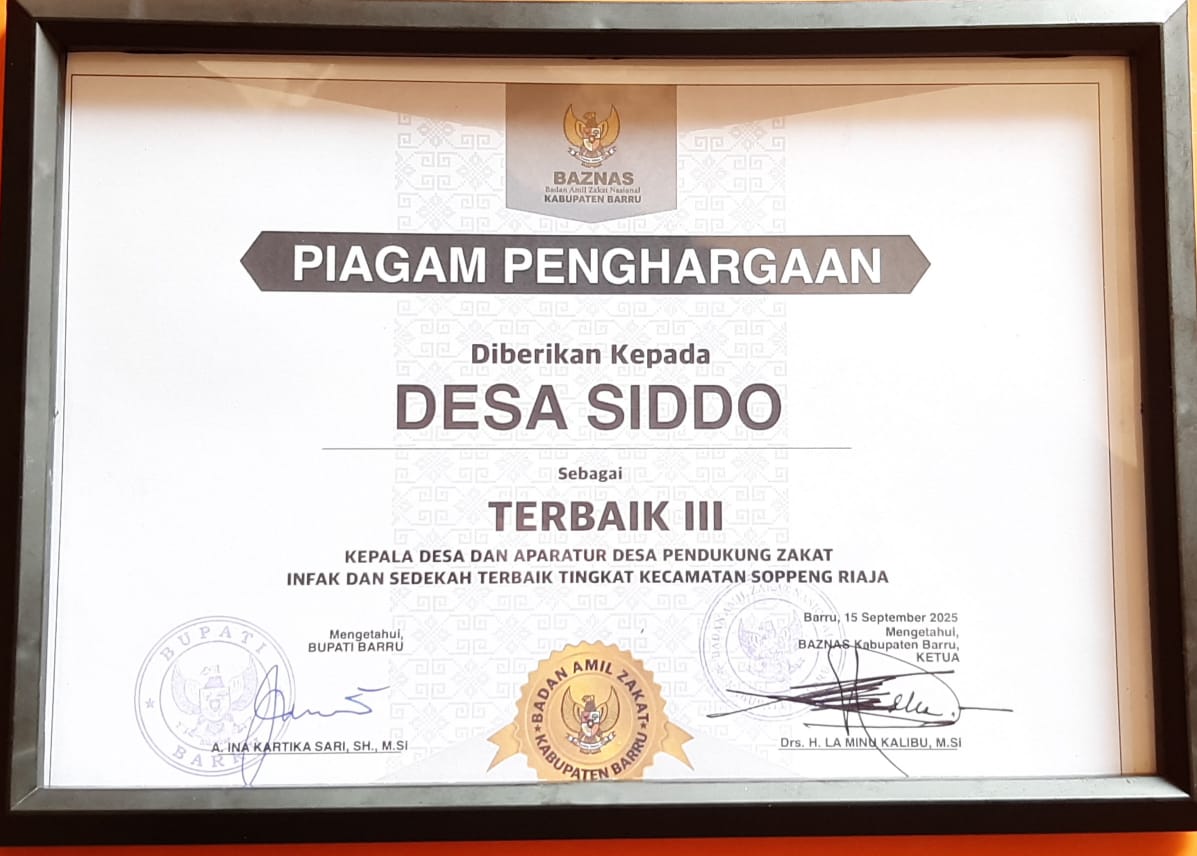 Pada hari yang sama, Desa Siddo juga berhasil menempati urutan ke-3 dari 5 Desa dan 2 Kelurahan tingkat Kecamatan Soppeng Riaja sebagai Kepala Desa dan Aparatur Pendukung Zakat, Infak, dan Sedekah (ZIS) BAZNAS Kabupaten Barru.
