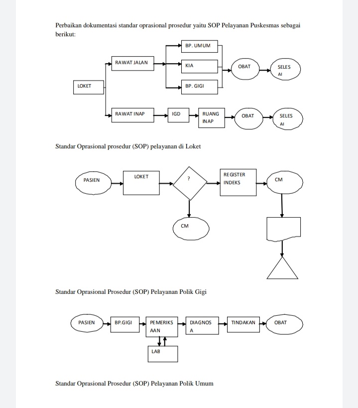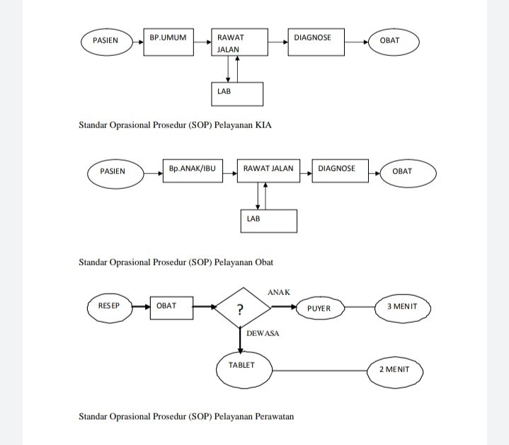 Standar operasional prosedur itu antara lain; – Standar Pelayanan Puskesmas, Standar Layanan Loket Pengambilan Kartu,Satandar Layanan Polik Gigi, Standar Layanan Polik Umum, Standar Layanan KIA dan Standar Layanan Obat – Standar Layanan Perawatan.