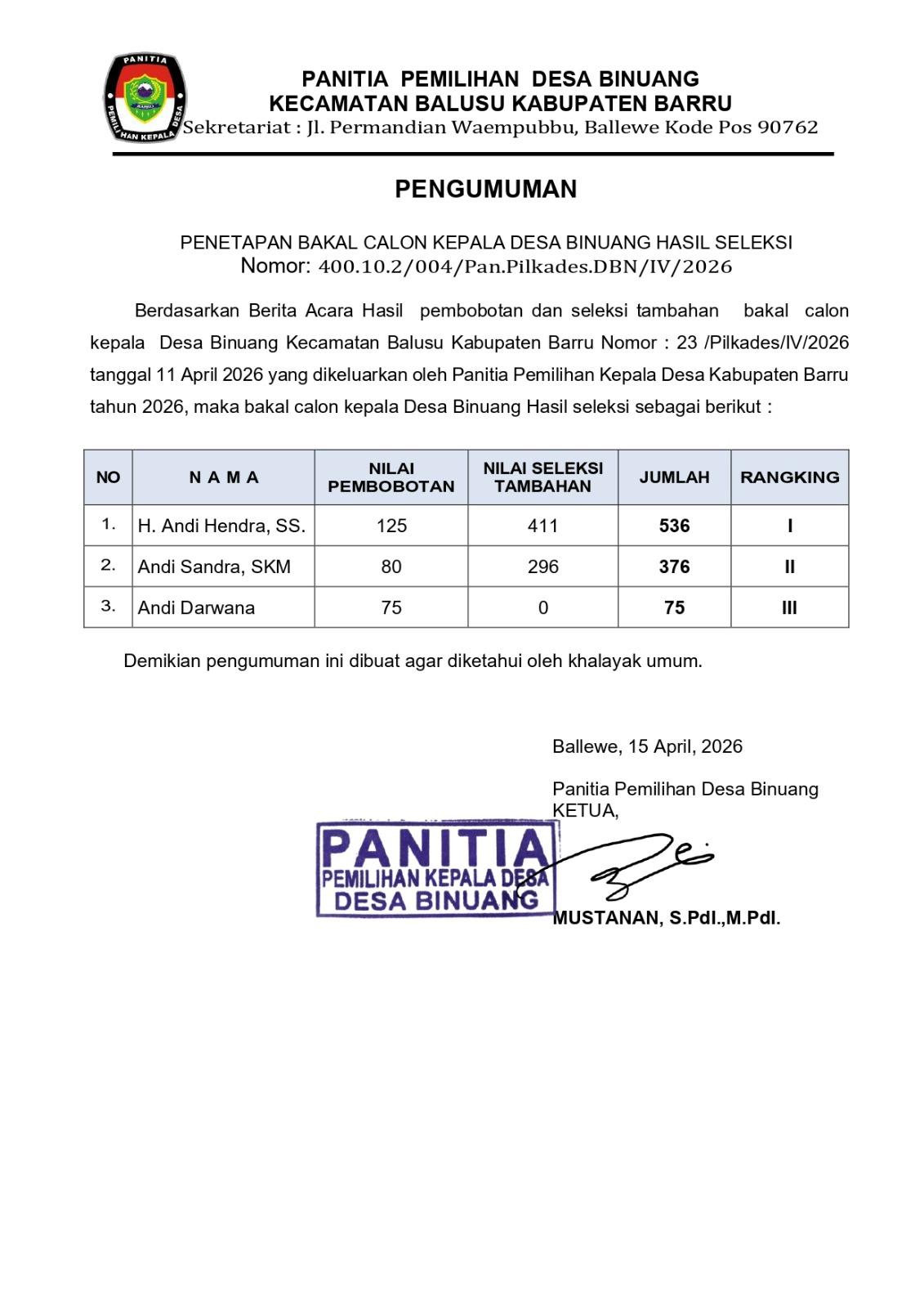 Barru, AK77NEWS.COM — Panitia Pemilihan Kepala Desa Tingkat Kabupaten Barru resmi mengumumkan hasil seleksi bakal calon Kepala Desa Binuang, Kecamatan Balusu, berdasarkan pembobotan dan seleksi tambahan, Selasa (15/4/2026).
