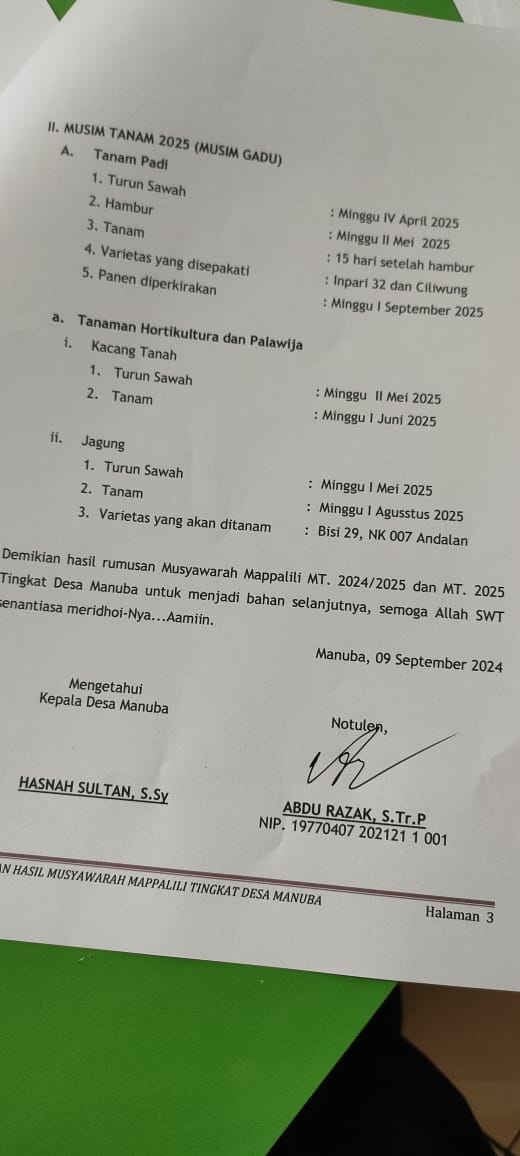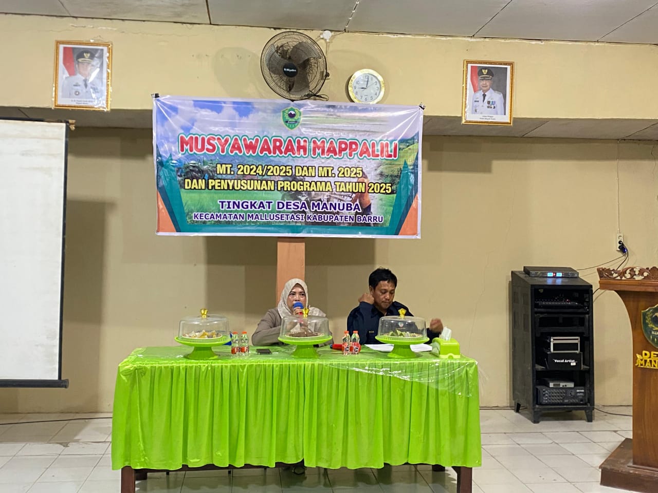 Musyawarah Mappalili Musim Tanam 2024/2025 dan penyusunan program pertanian 2025 dilaksanakan Pemerintah Desa (Pemdes) Manuba kecamatan Mallusetasi, kabupaten Barru,Selasa 10 September 2024.