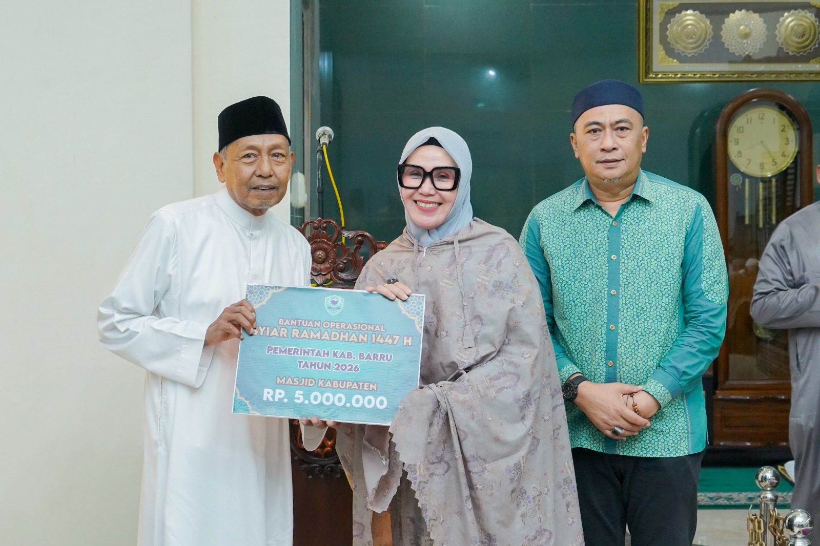 Kegiatan yang berlangsung khidmat ini diawali dengan shalat Isya berjamaah serta penyerahan bantuan biaya operasional Syiar Ramadan 1447 Hijriah kepada pengurus Masjid Agung Nurul Iman oleh Bupati Barru sebagai bentuk dukungan terhadap kegiatan dakwah dan syiar Islam selama bulan suci Ramadan.