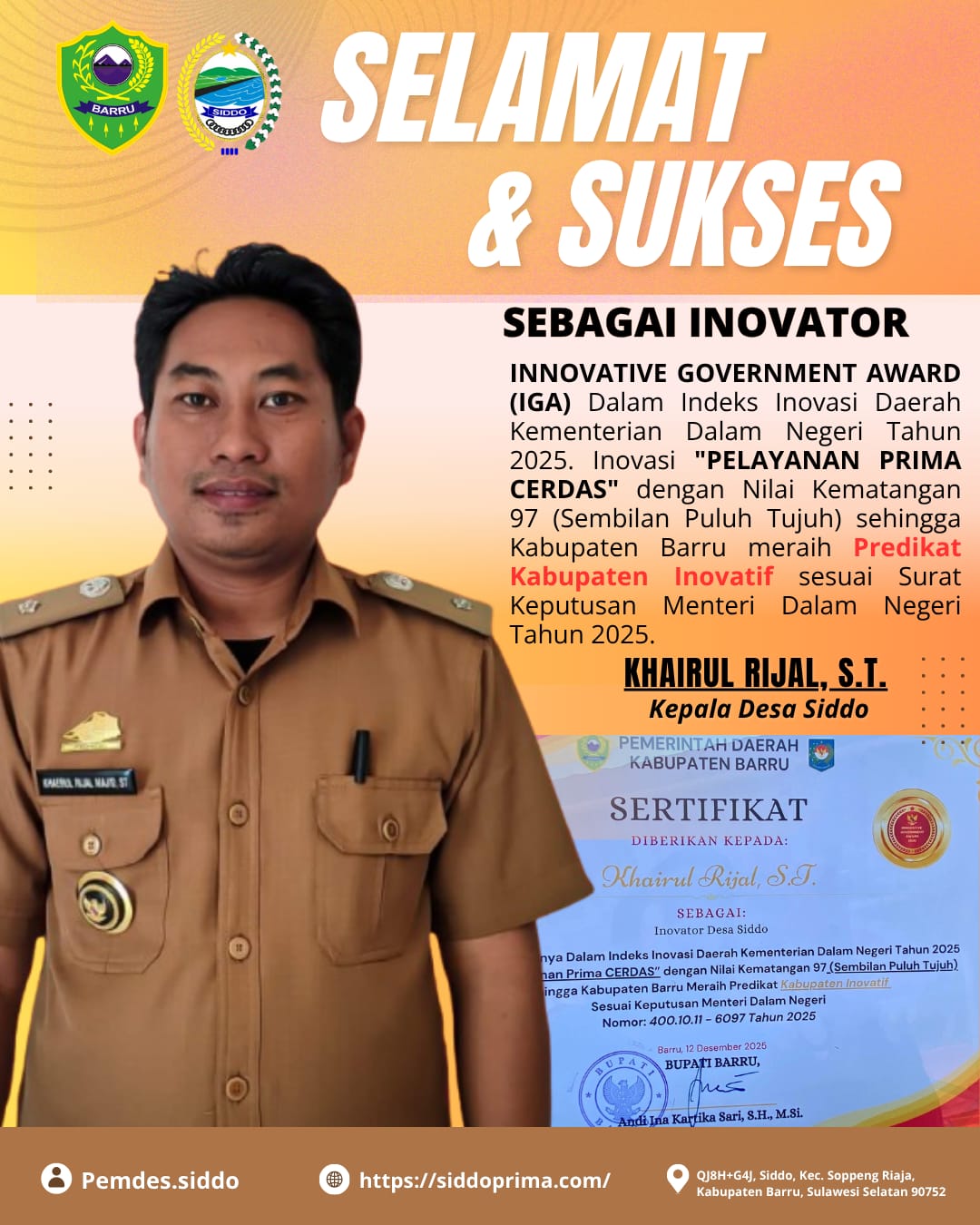 Inovasi ini merupakan visi-misi Khairul Rijal dan telah berjalan 3 tahun sejak dilantik sebagai Kades Siddo tahun 2023. Inovasi dinilai aplikatif dan visioner karena dilengkapi data, bukti lapangan, serta dampak sosial yang terukur.