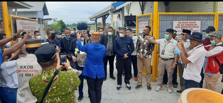 Bupati Suardi Saleh turut didampingi Sekda Barru Dr. Abustan dan rombongan disambut dengan tarian Waututu dan pemasangan Upaota dan Noken oleh ketua DPW KKDB Papua.