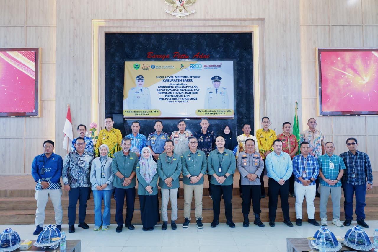 BARRU AK77NEWS.COM -Mewakili Bupati Barru, Wakil Bupati Barru Abustan A. Bintang, membuka secara resmi membuka secara resmi High Level Meeting Tim Percepatan dan Perluasan Digitalisasi Daerah (TP2DD) yang dirangkaikan dengan Launching QRIS SIAP Pasar, Evaluasi Realisasi Pendapatan Asli Daerah (PAD) Triwulan I Tahun 2026, serta Penyerahan SPPT PBB-P2 dan DHKP Tahun 2026, di Lantai 6 MPP Kantor Bupati Barru, Kamis (23/4/2026).